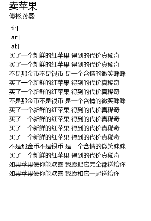 | [00:12.13] | 买了一个新鲜的红苹果 得到的代价真稀奇 |