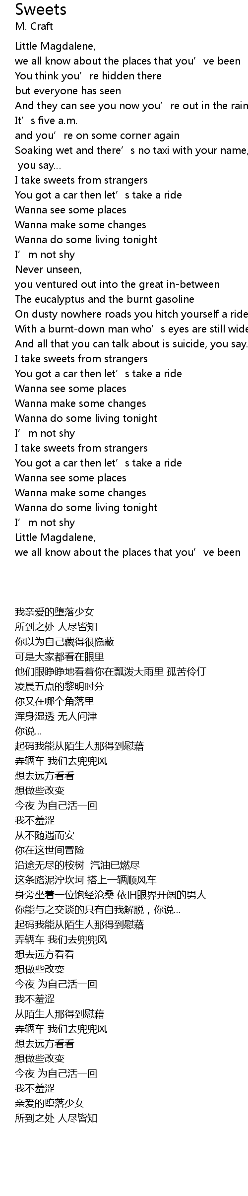 | [00:58.14] | I take sweets from strangers |