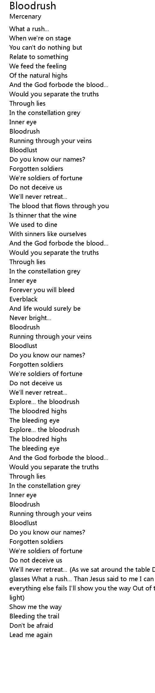| We'll never retreat... (As we sat around the table Drinking the blood from our glasses What a rush... Than Jesus said to me I can cure you my friend... If everything else fails I'll show you the way Out of the darkness And into the light) | |