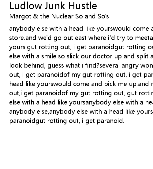 anybody else with a head like yourswould come and pick me up at the liquor store.and we'd go out east where i'd try to meetanybody else with a head like yours.gut rotting out, i get paranoidgut rotting out, i get paranoidof anybody else with a smile so slick.our doctor up and split and we both got sick.when i look behind, guess what i find?several angry women holding bottlesgut rotting out, i get paranoidof my gut rotting out, i get paranoid.anybody else with a head like yourswould come and pick me up.and my gut's rotting out, gut's rotting out,i get paranoidof my gut rotting out, gut rotting out,i get paranoid.anybody else with a head like yoursanybody else with a head like yoursanybody else, anybody else,anybody else with a head like yoursgut rotting out, i get paranoidgut rotting out, i get paranoid. |