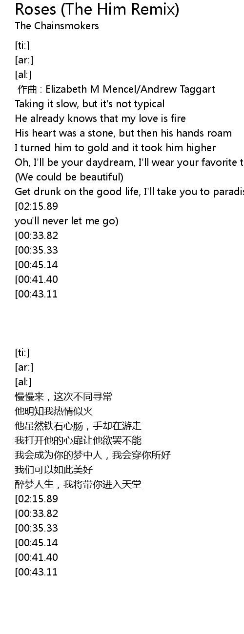 | [00:00.00] | 作曲 : Elizabeth M Mencel/Andrew Taggart |