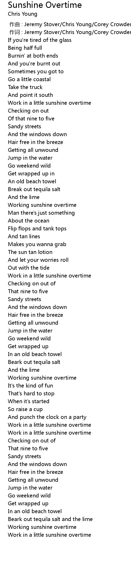 | [00:01.00] | 作词 : Jeremy Stover/Chris Young/Corey Crowder |