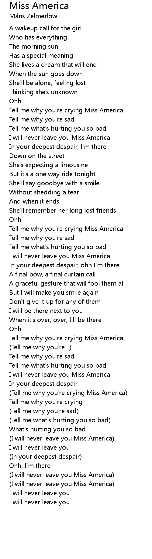 Tell me why you're crying Miss America |
