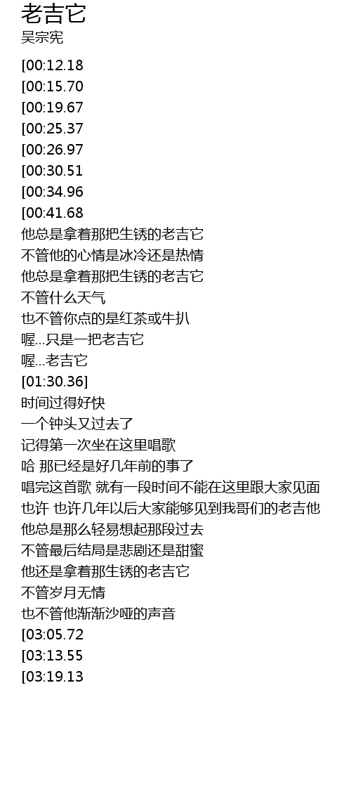 | [02:01.57][00:12.18] | 一把生锈的老吉它 |
