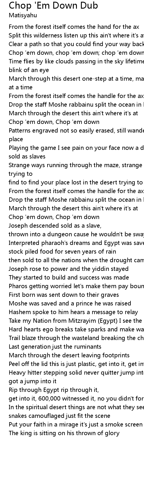 | Chop 'em down, chop 'em down; chop 'em down, chop 'em down | |