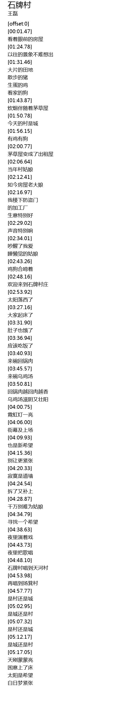| [02:50.01] | 欢迎来到石牌村庄 |