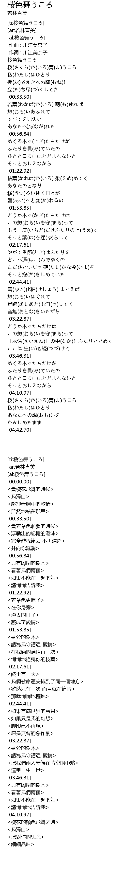 | [04:21.52] | 桜(さくら)色(いろ)舞(ま)うころ |