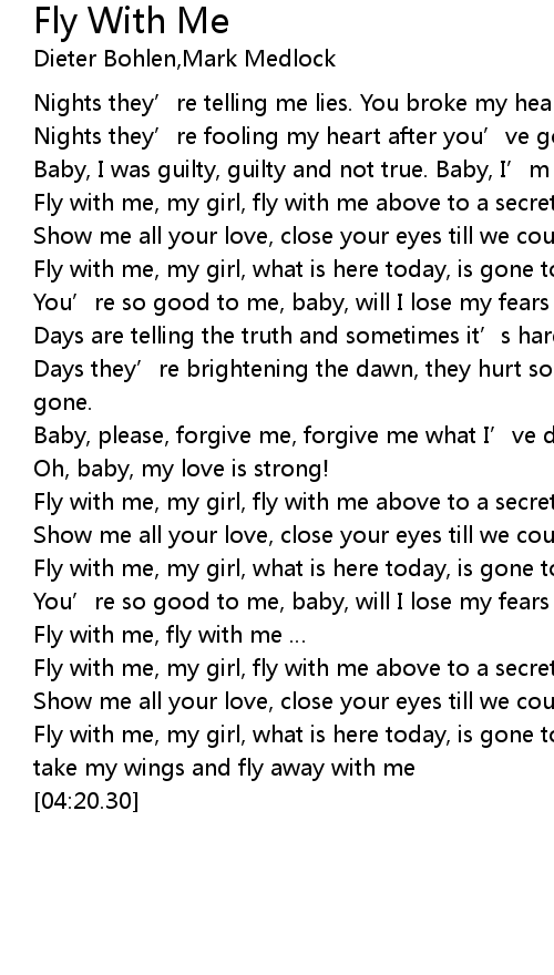 | [03:29.94] | Fly with me, my girl, what is here today, is gone tomorrow, come and take my wings and fly away with me |