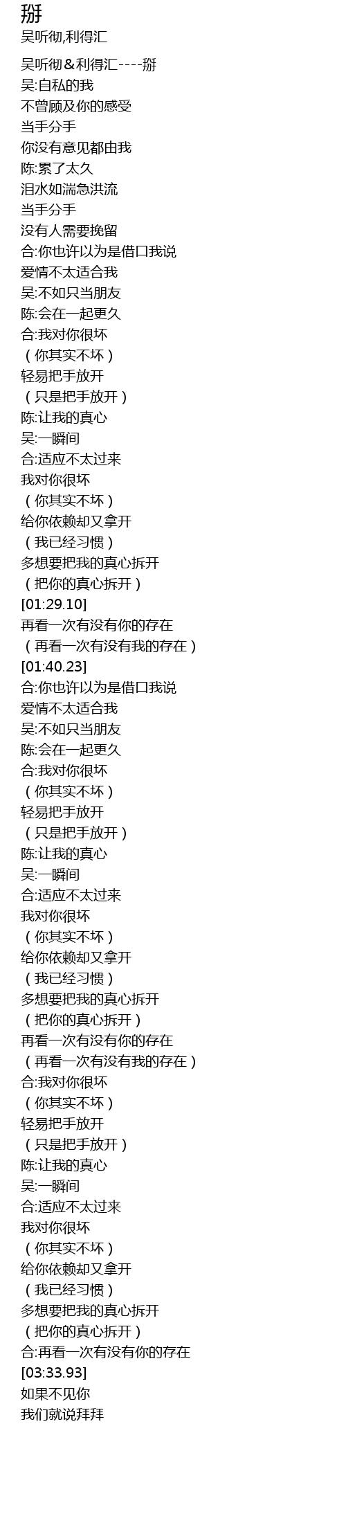 | [00:06.38] | 吴听彻&利得汇----掰 |