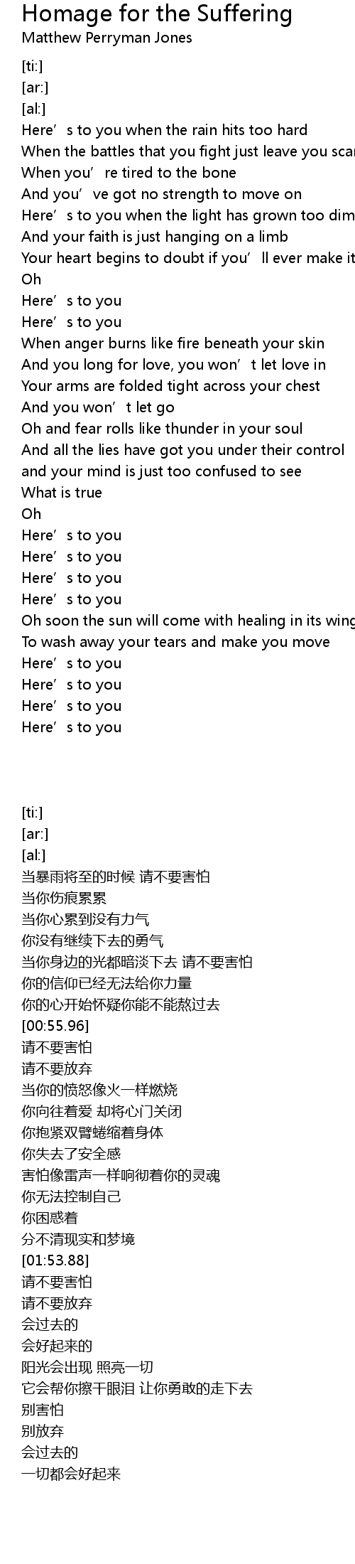 | [02:22.18] | Oh soon the sun will come with healing in its wings |