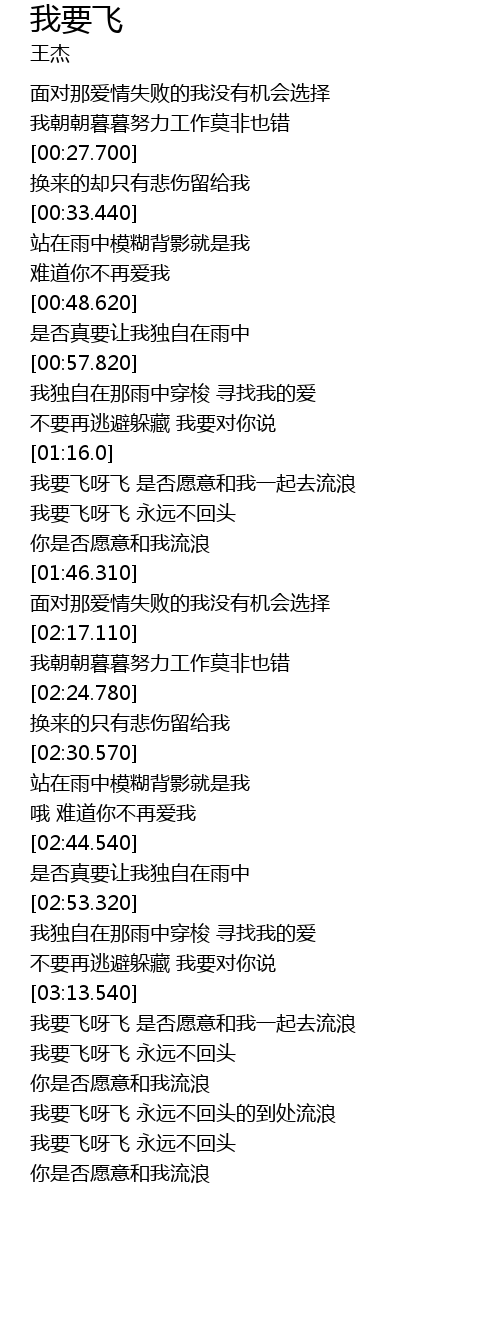 | [03:14.610] | 我要飞呀飞 是否愿意和我一起去流浪 |