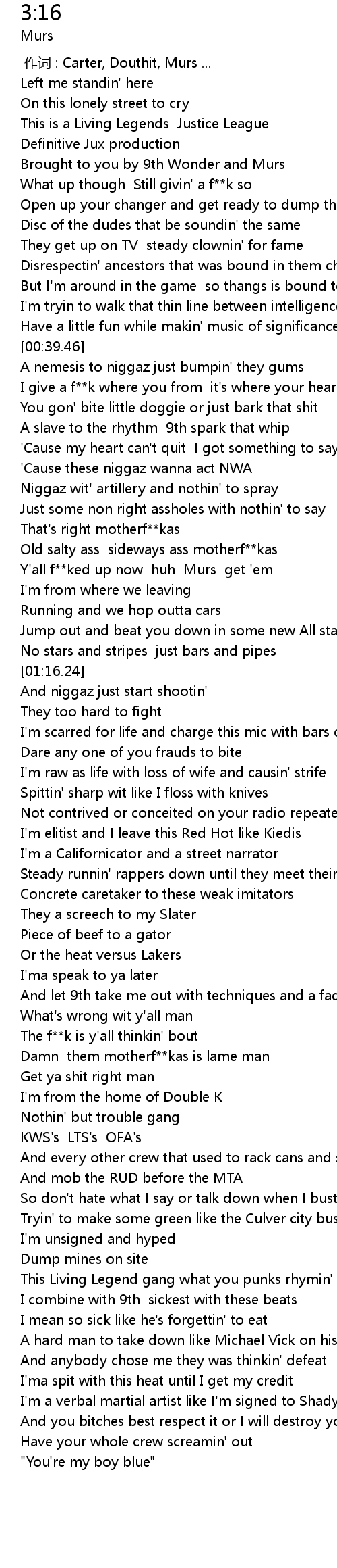 | [01:06.18] | Y' all f ked up now huh Murs get ' em |