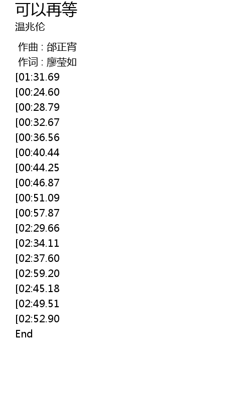 | [03:14.69][02:59.20][02:41.68][01:14.76] | 可以再等爱情 |