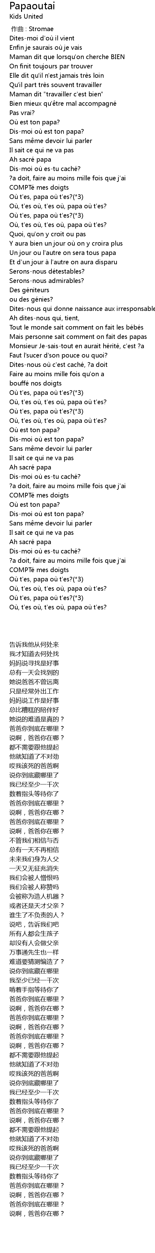 | [02:08.39] | Où, t'es où, t'es où, papa où t'es? |