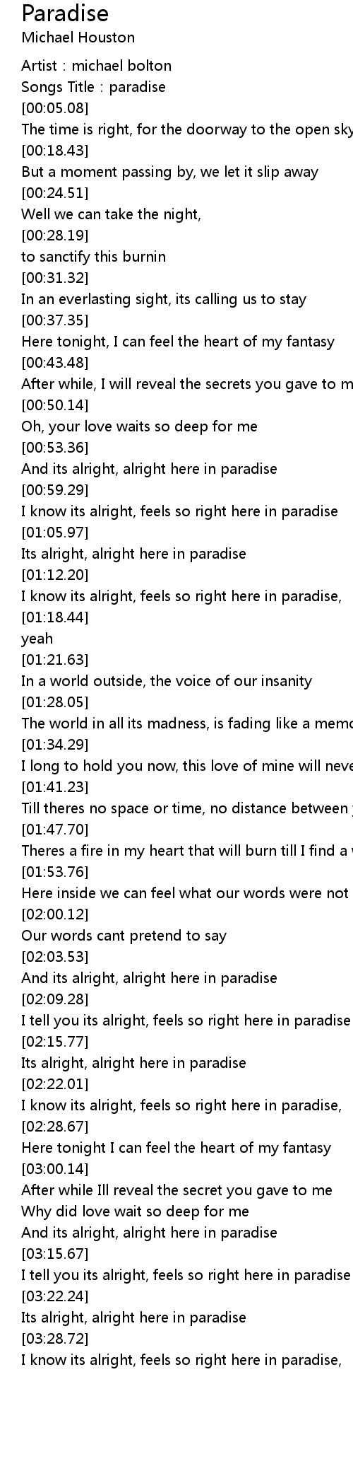 | [03:16.55] | I tell you its alright, feels so right here in paradise |