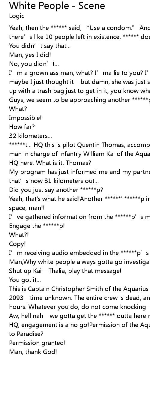 | [00:56.78] | Man,Why white people always gotta go investigating ******t, man?! |