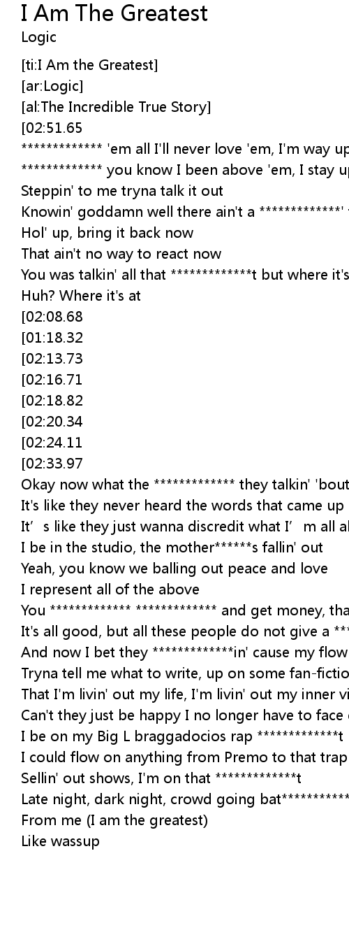 | [01:15.19][02:18.82] | Like wassup I am the greatest |