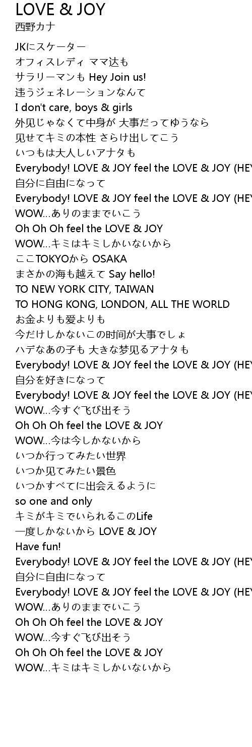 | [00:43.47] | Everybody! LOVE & JOY feel the LOVE & JOY (HEY) |