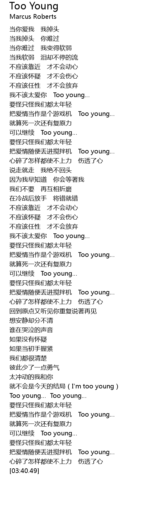 | [03:20.08] | bǎ ài qíng dàng zuò shì gè yóu xì jī Too young |