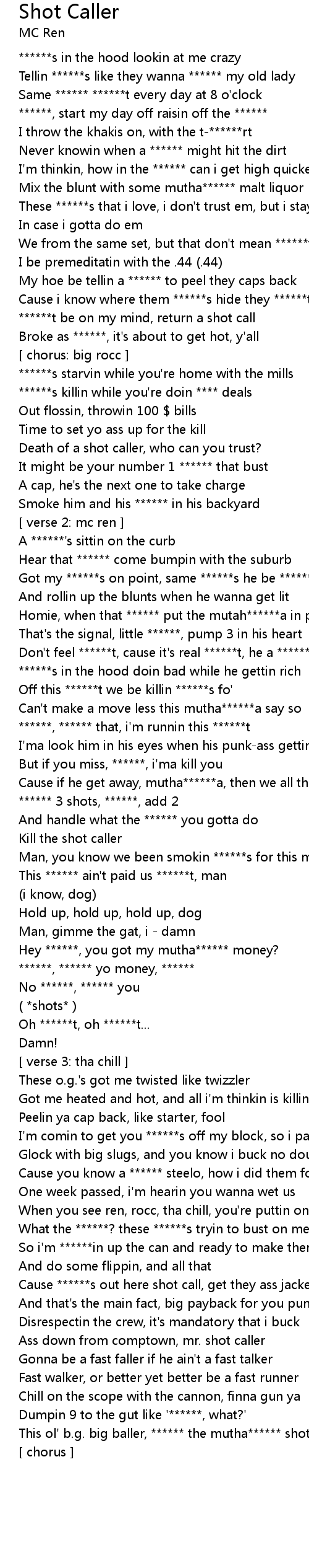 | This ol' b.g. big baller, ****** the mutha****** shot caller | |