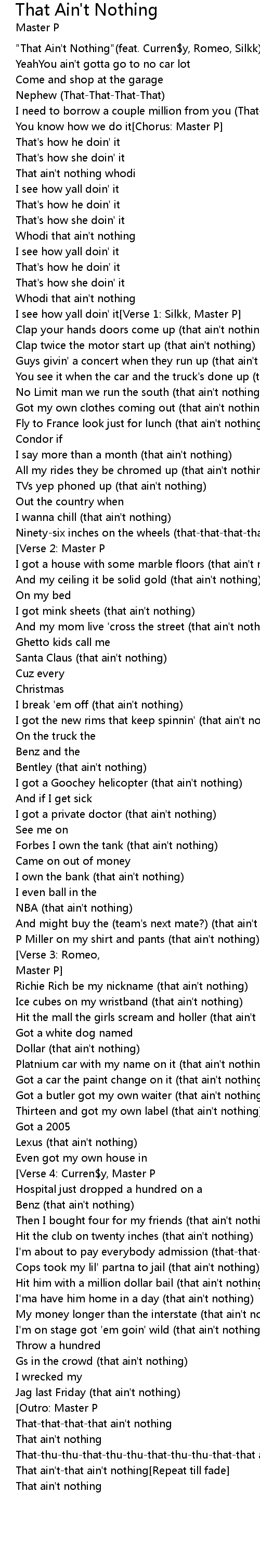 Got another one in my driveway (that ain't nothing)[Chorus][Outro: Master P] |
