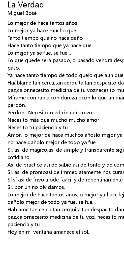 | Ha blame tan cerca, tan cerquita, tan despacito dame aliento, dame mucha paz, calornecesito medicina de tu voz, necesito muchomucho mucho amornecesito tu paciencia y tu... | |