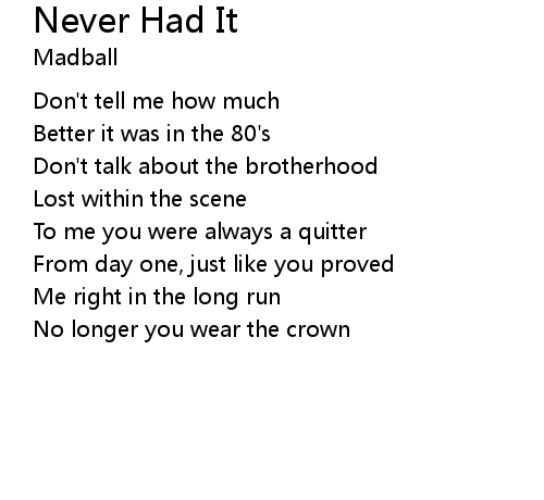 | Song | Never Had It |