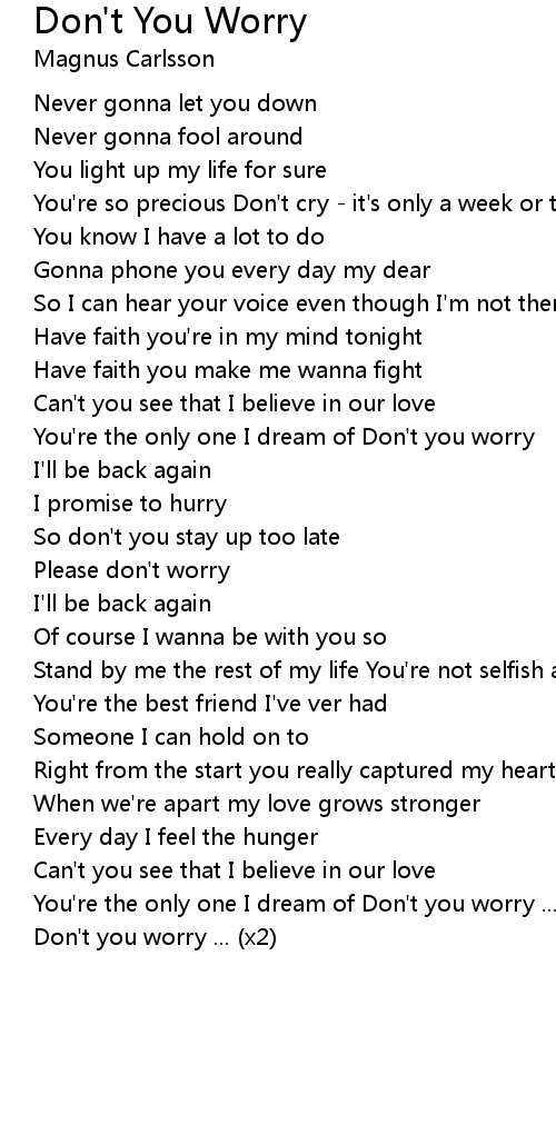 You're the only one I dream of Don't you worry ... Never gonna let you down ... Don't you worry ... (x2) |