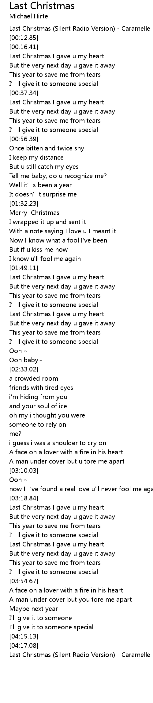 | [00:19.35] | Last Christmas I gave u my heart |