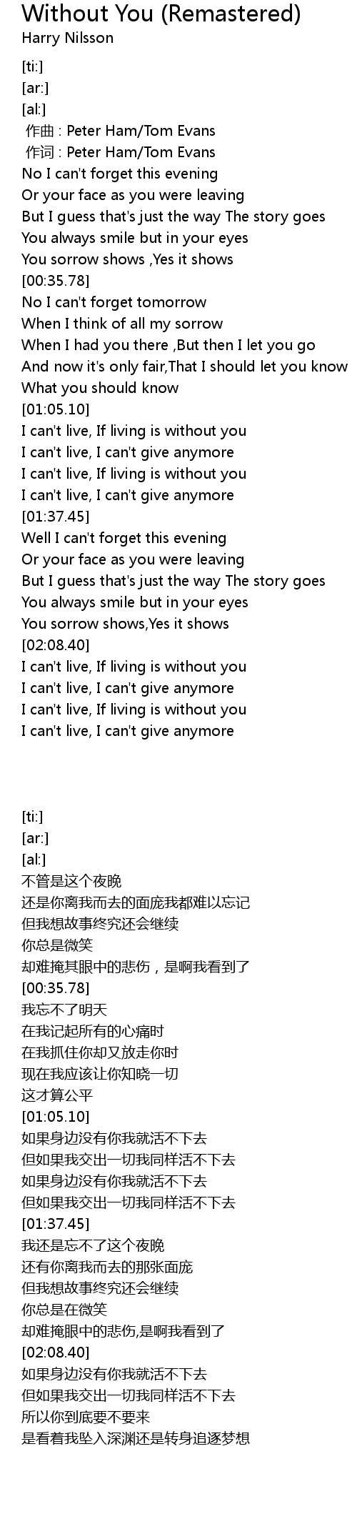 | [01:30.71] | I can' t live, I can' t give anymore |
