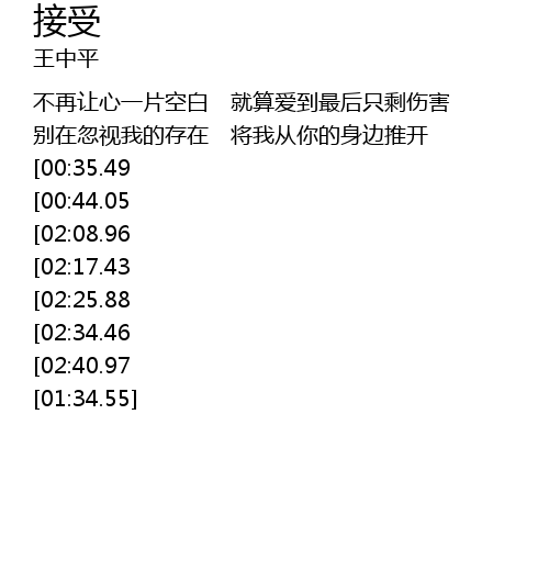 | [02:47.48][02:08.96][00:51.74] | 请你接受我的心 别再将我的爱轻易退还 |