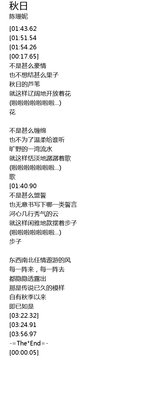 | [04:02.27][01:43.62][00:00.00] | -= 陈珊妮 《 秋日 》=- |