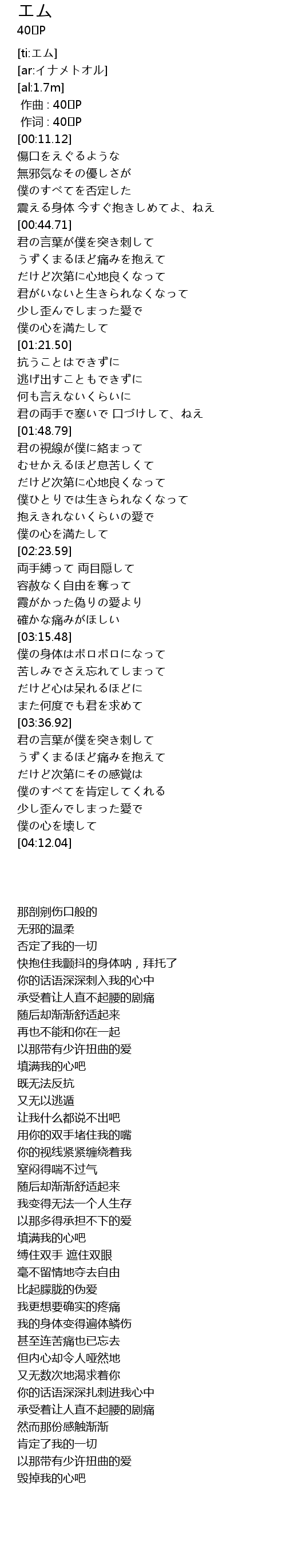 | [00:35.54] | 震える身体 今すぐ抱きしめてよ、ねえ |