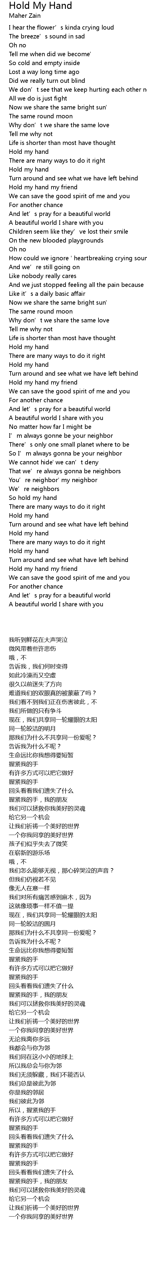 | [00:43.350] | We don' t see that we keep hurting each other no |