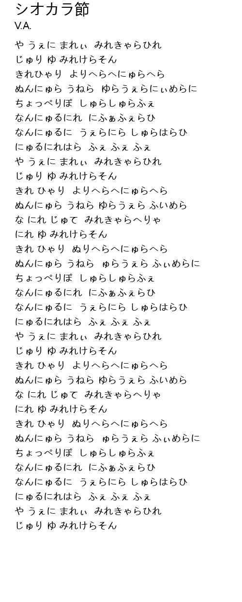 | [00:53.17] | ぬんにゅら うねら ゆらうぇら ふいめら |