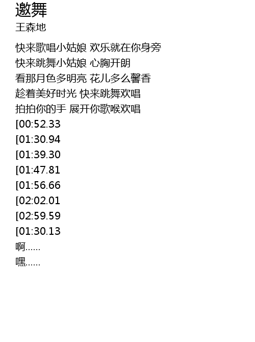 | [00:29.91] | kuài lái tiào wǔ xiǎo gū niáng xīn xiōng kāi lǎng |