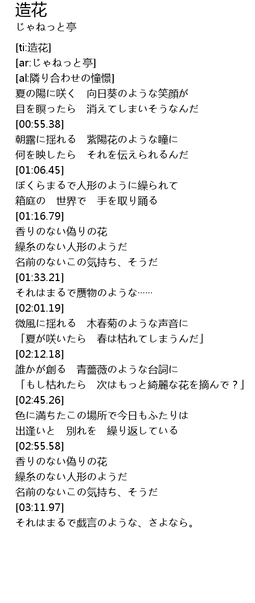 | [02:17.73] | 「もし枯れたら 次はもっと綺麗な花を摘んで?」 |