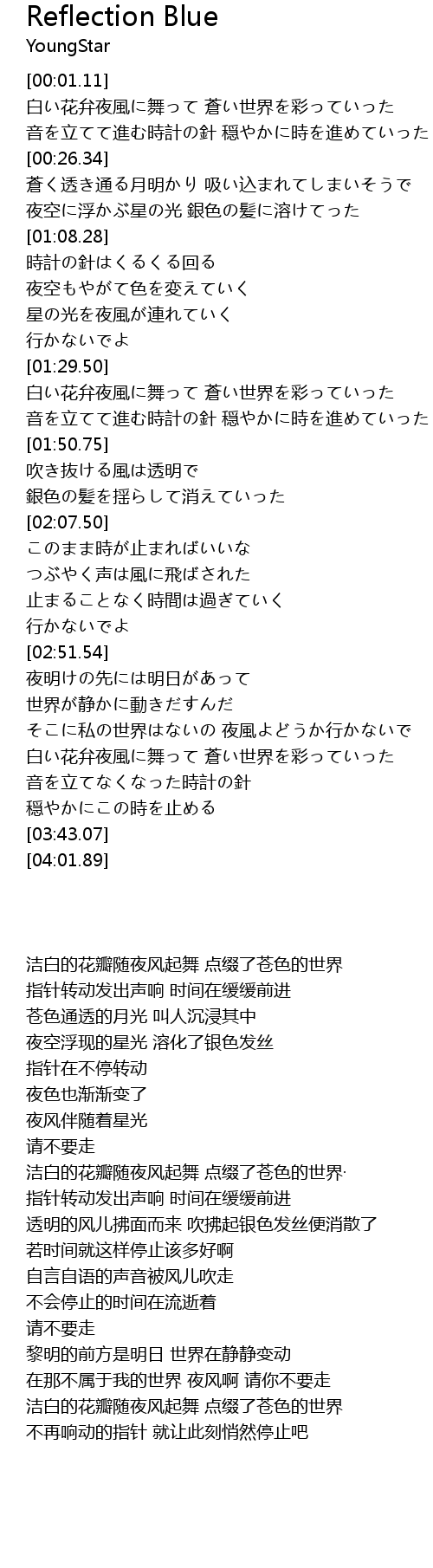 | [01:29.72] | 白い花弁夜風に舞って 蒼い世界を彩っていった |