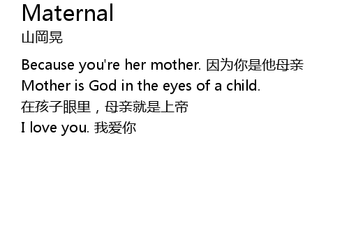 | [00:35.76] | Mother is God in the eyes of a child. zài hái zi yǎn lǐ, mǔ qīn jiù shì shàng dì |