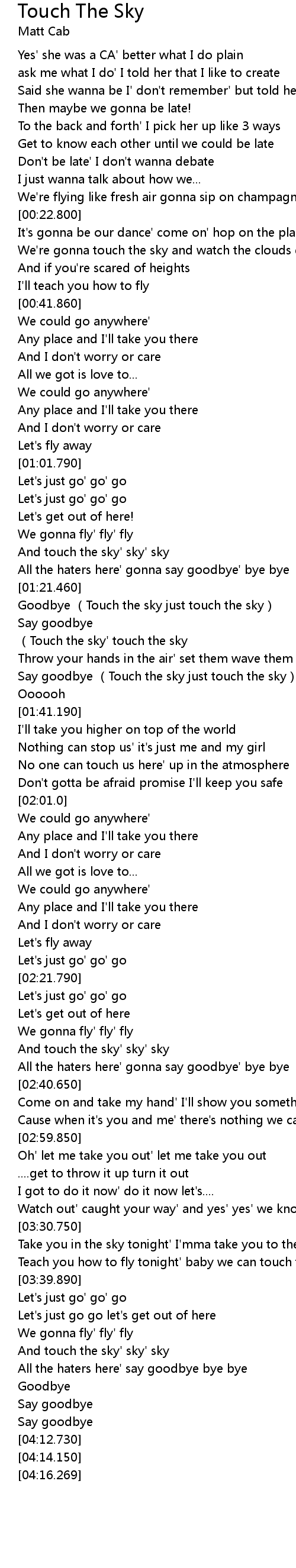 | [01:22.900] | Goodbye Touch the sky just touch the sky |