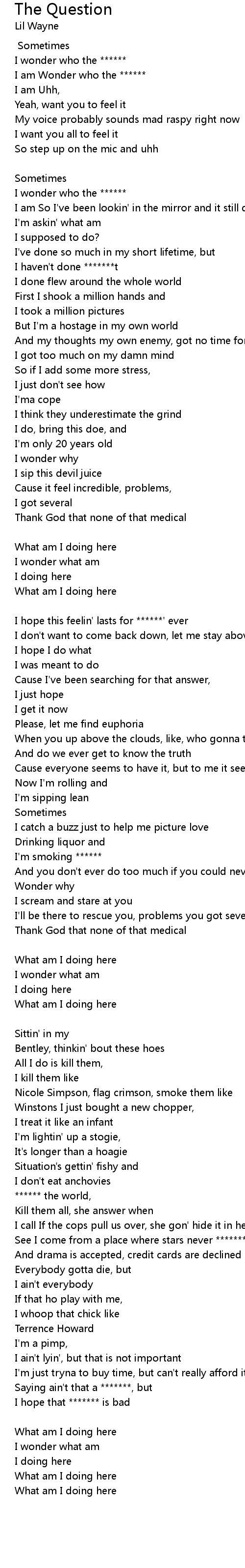 | What am I doing here [Verse 3: Lil Wayne] | |