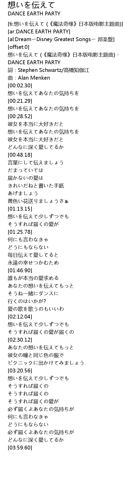 | [00:00.27] | 想いを伝えて (《魔法奇缘》日本版电影主题曲) - DANCE EARTH PARTY |