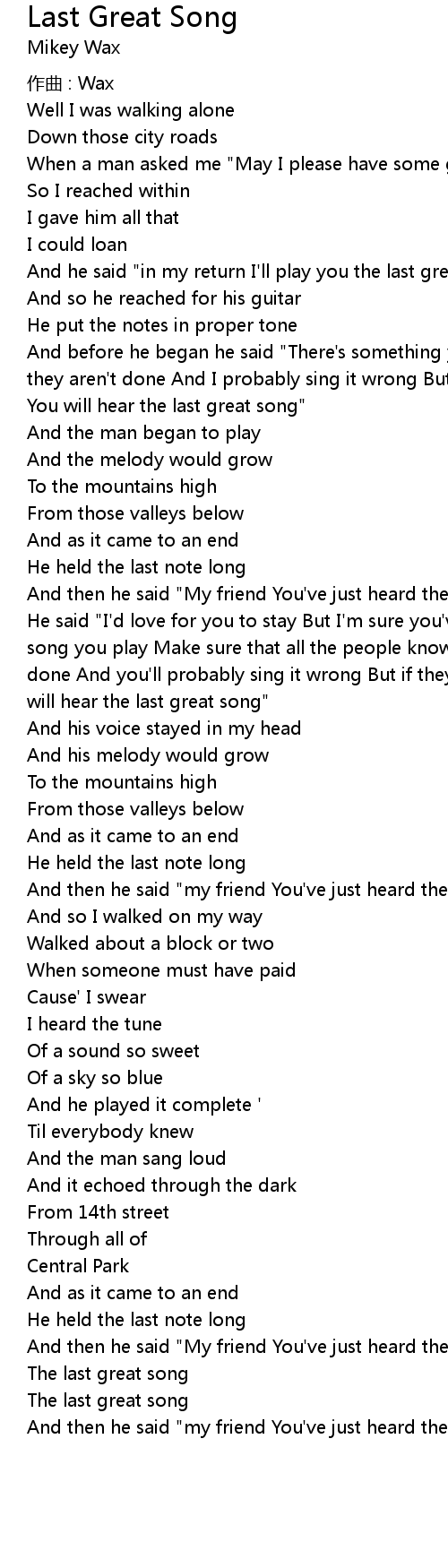 | And before he began he said " There' s something you should know Now the words they aren' t done And I probably sing it wrong But if you look beyond the flaws You will hear the last great song" | |