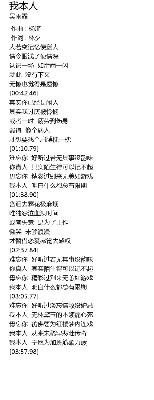 | [02:38.18] | 难忘你 好听过若无其事没韵味 |