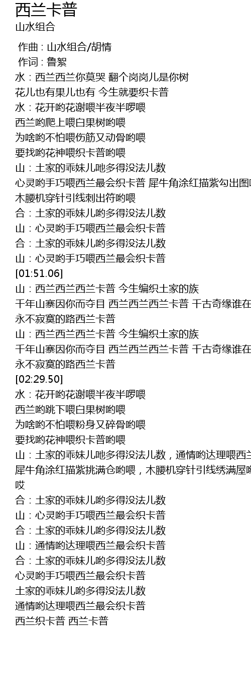 | [01:52.22] | 山:西兰西兰西兰卡普 今生编织土家的族 千年山寨因你而夺目 西兰西兰西兰卡普 千古奇缘谁在欢呼 永不寂寞的路西兰卡普 |