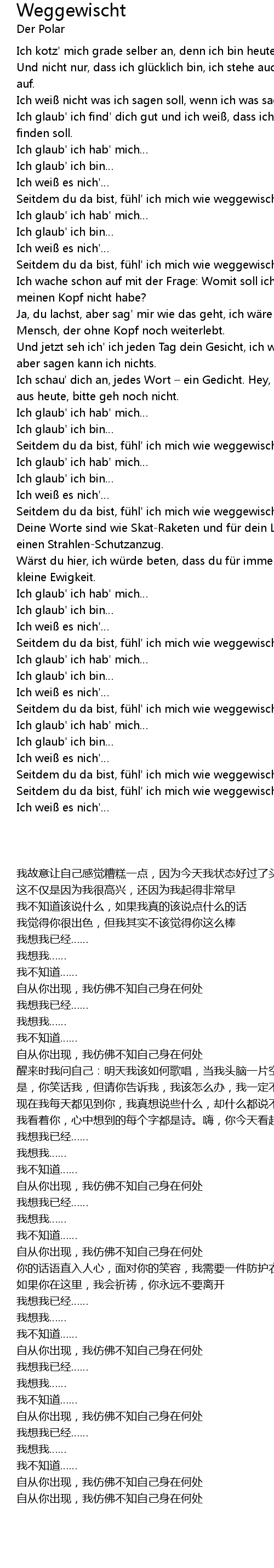 | [01:52] | Seitdem du da bist, fühl' ich mich wie weggewischt. |