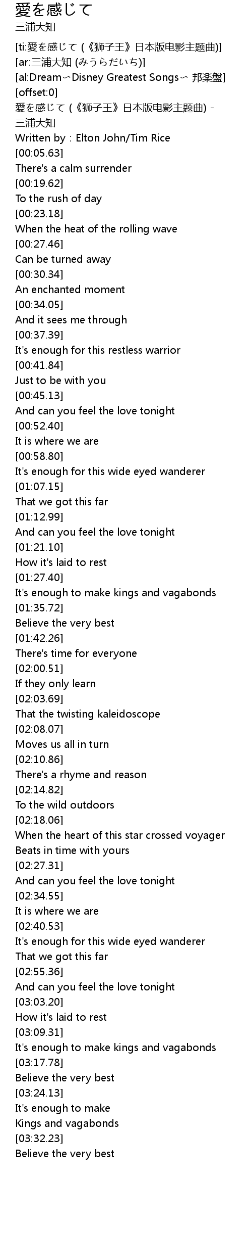 | [00:00.80] | 愛を感じて (《狮子王》日本版电影主题曲) - 三浦大知 |