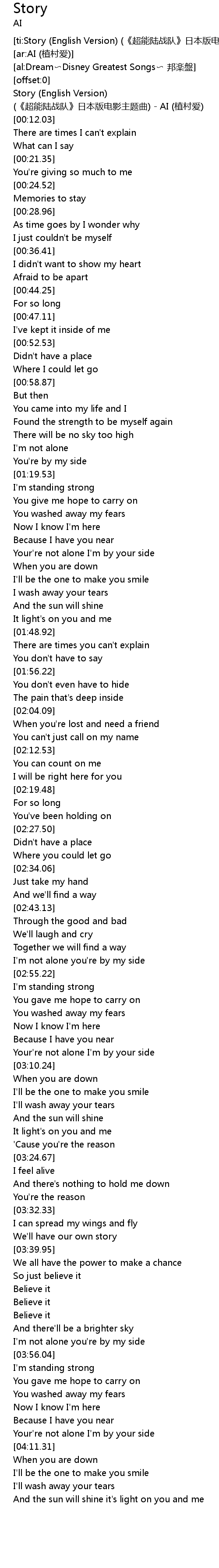 | [00:00.87] | Story (English Version) (《超能陆战队》日本版电影主题曲) - AI (植村爱) |