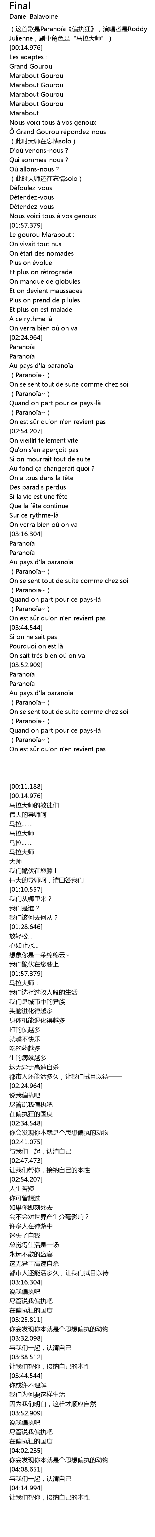 | [00:11.188] | (这首歌是Paranoïa《偏执狂》,演唱者是Roddy Julienne,剧中角色是“马拉大师”) |