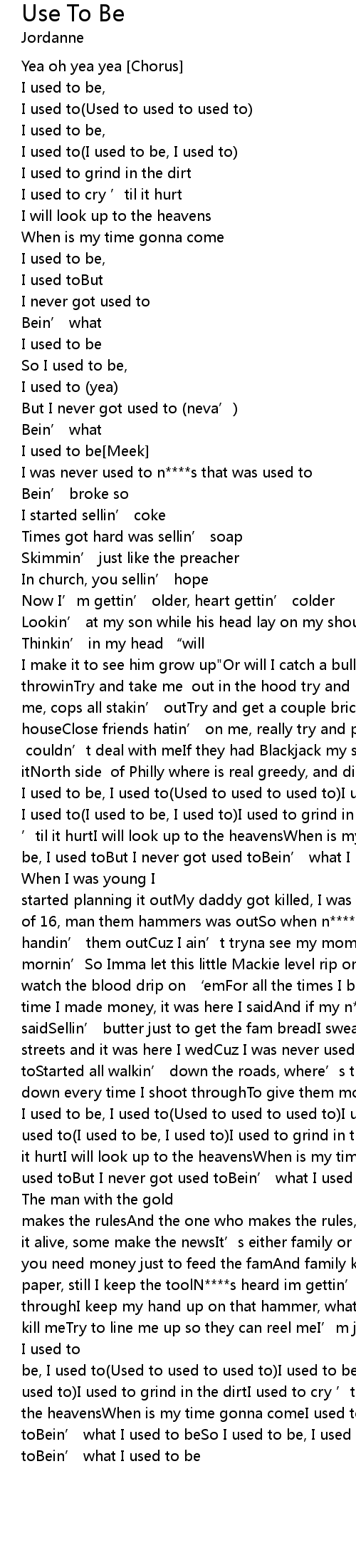 | I make it to see him grow up" Or will I catch a bullet from some these n s throwinTry and take me out in the hood try and make it outN s plotting on me, cops all stakin' outTry and get a couple bricks so I could make a houseClose friends hatin' on me, really try and play me outDamn, but n s couldn' t deal with meIf they had Blackjack my shooters would still hit itNorth side of Philly where is real greedy, and dirty atWhere everyday they murder at Chorus I used to be, I used to Used to used to used to I used to be, I used to I used to be, I used to I used to grind in the dirtI used to cry ' til it hurtI will look up to the heavensWhen is my time gonna comeI used to be, I used toBut I never got used toBein' what I used to beSo I used to be, I used toBut I never got used toBein' what I used to be Meek When I was young I started planning it outMy daddy got killed, I was the man of the houseBy the age of 16, man them hammers was outSo when n s tryin' to hit me, I' m just handin' them outCuz I ain' t tryna see my mom cryin' and my sis' mornin' So Imma let this little Mackie level rip on ' emLouis Vuitton sneaks, watch the blood drip on ' emFor all the times I bled, the tears I shedEvery time I made money, it was here I saidAnd if my n s ask for it was " yea" I saidSellin' butter just to get the fam breadI swear I got married to the streets and it was here I wedCuz I was never used to bein' what I used toStarted all walkin' down the roads, where' s the coop toImma let the top down every time I shoot throughTo give them motivation even though I know they hatin chorus I used to be, I used to Used to used to used to I used to be, I used to I used to be, I used to I used to grind in the dirtI used to cry ' til it hurtI will look up to the heavensWhen is my time gonna comeI used to be, I used toBut I never got used toBein' what I used to beSo I used to be, I used toBut I never got used toBein' what I used to be Meek The man with the gold makes the rulesAnd the one who makes the rules, break the rulesSome n s make it alive, some make the newsIt' s either family or money, I hate to chooseCuz you need money just to feed the famAnd family keep you coolGot n a on the paper, still I keep the toolN s heard im gettin' money so they creepin' throughI keep my hand up on that hammer, what' s for me to doLet these n s kill meTry to line me up so they can reel meI' m just givin' you the real meStarted with a dollar, now I got it and I' m filthyN a! chorus I used to be, I used to Used to used to used to I used to be, I used to I used to be, I used to I used to grind in the dirtI used to cry ' til it hurtI will look up to the heavensWhen is my time gonna comeI used to be, I used toBut I never got used toBein' what I used to beSo I used to be, I used toBut I never got used toBein' what I used to be |